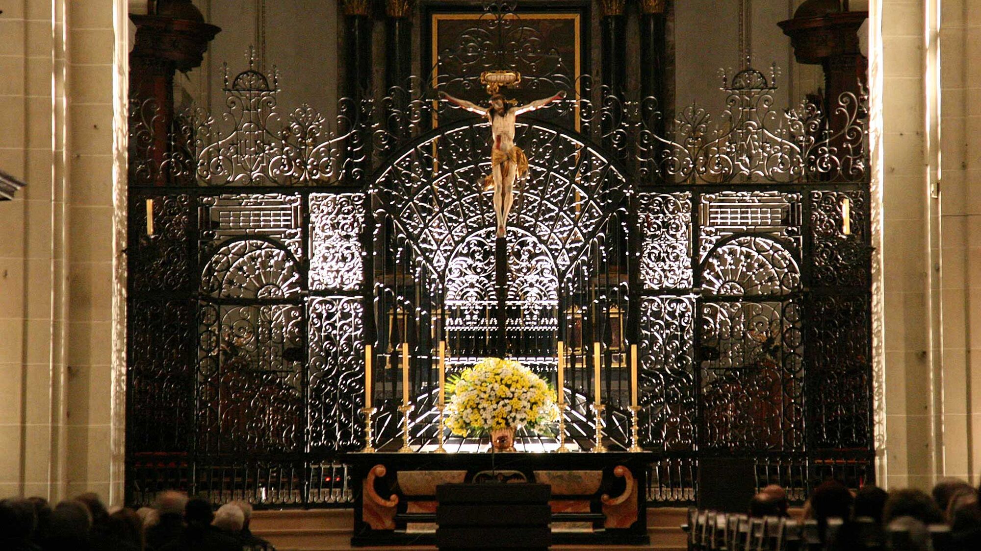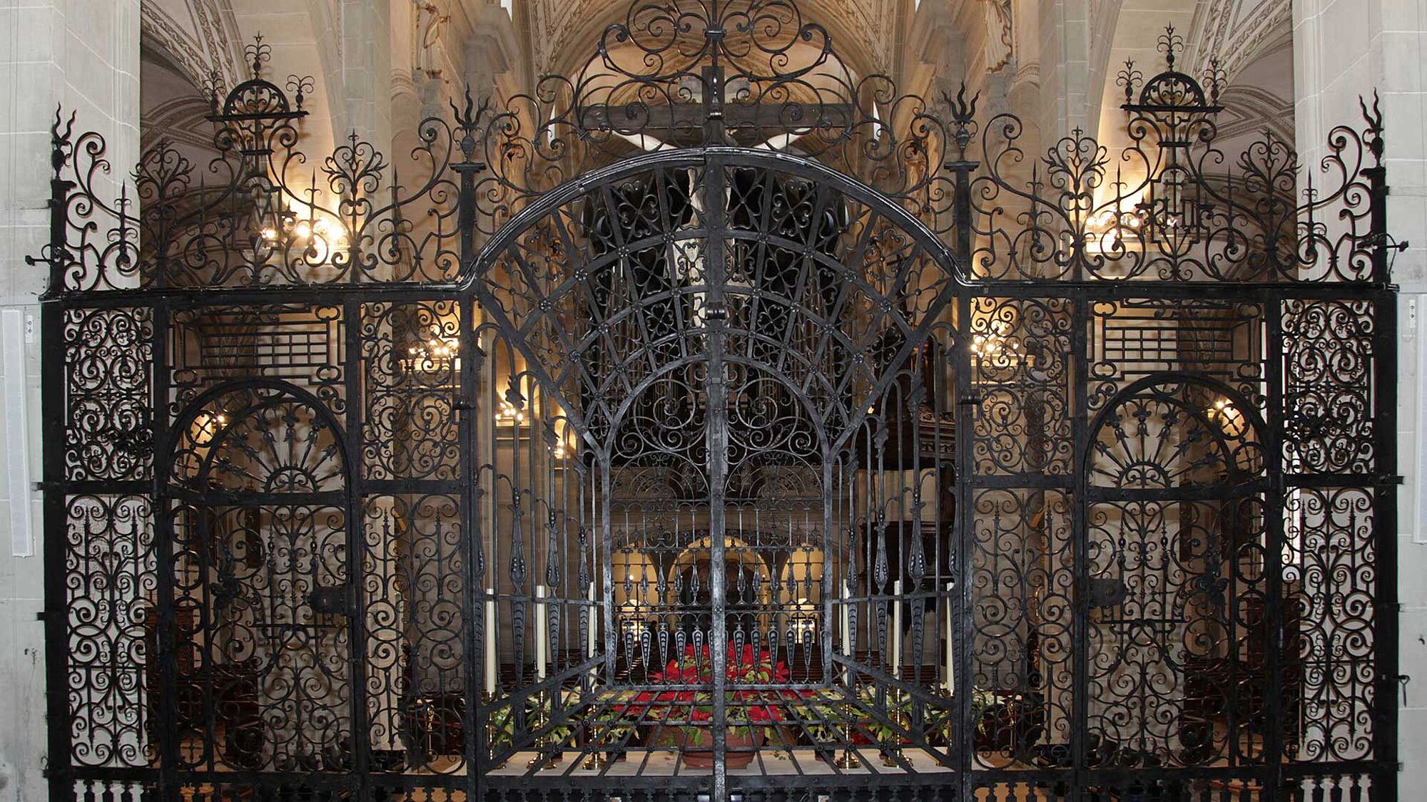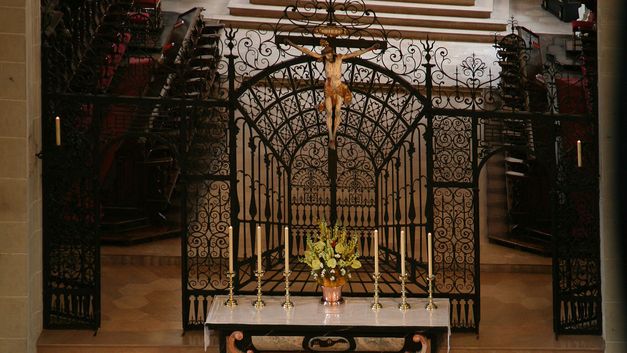 Das Chorgitter (1643) gilt als frühes Beispiel eines perspektivischen Gitters. Das grosse Kruzifix am Gitter stammt aus dem 16. Jahrhundert und wurde ebenfalls aus den Flammen der brennenden Kirche gerettet.