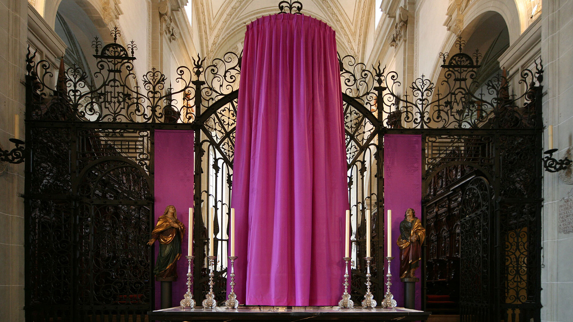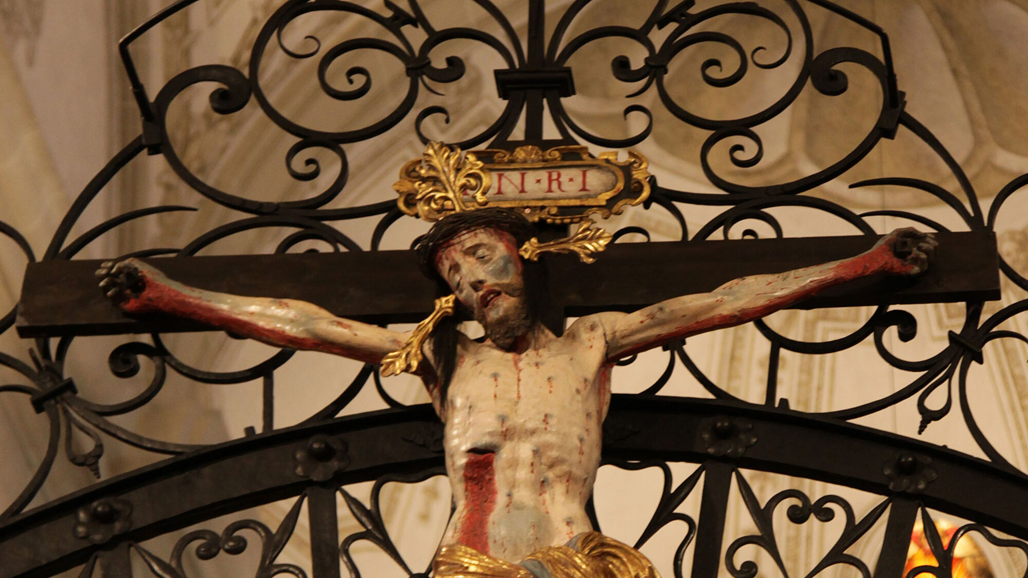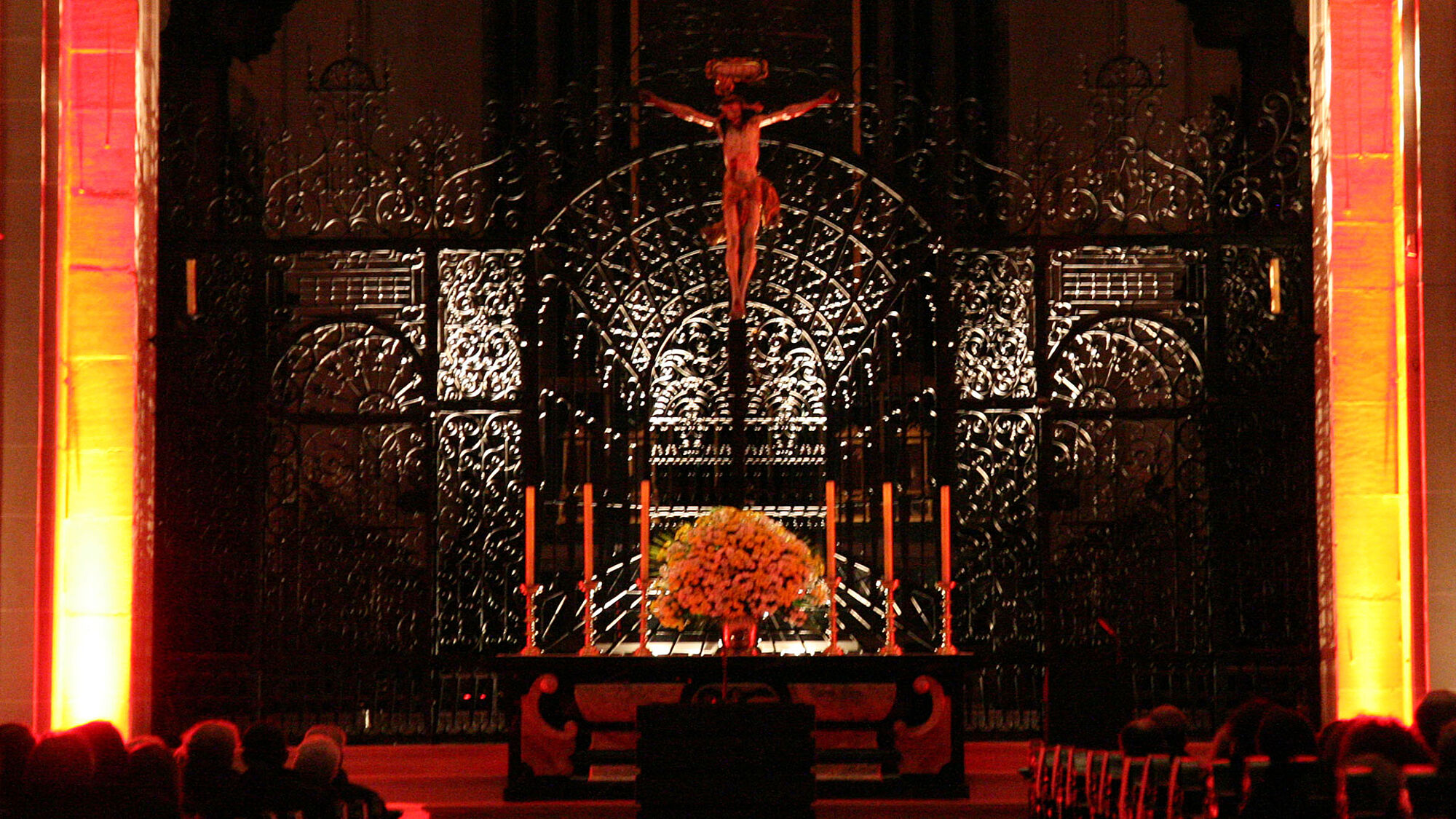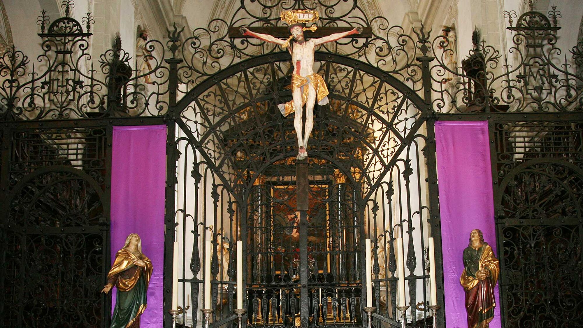 Das Chorgitter (1643) gilt als frühes Beispiel eines perspektivischen Gitters. Das grosse Kruzifix am Gitter stammt aus dem 16. Jahrhundert und wurde ebenfalls aus den Flammen der brennenden Kirche gerettet.