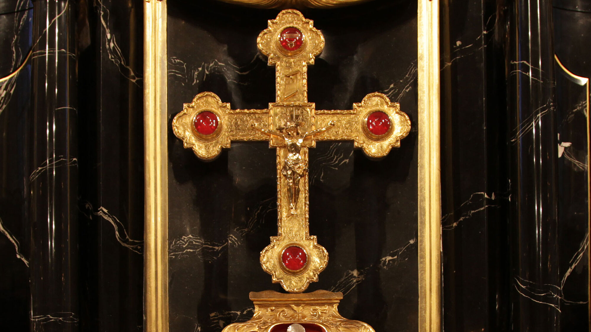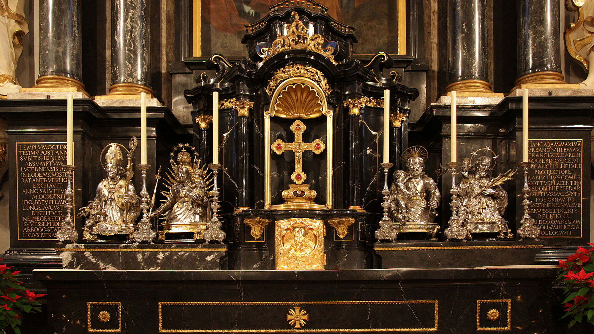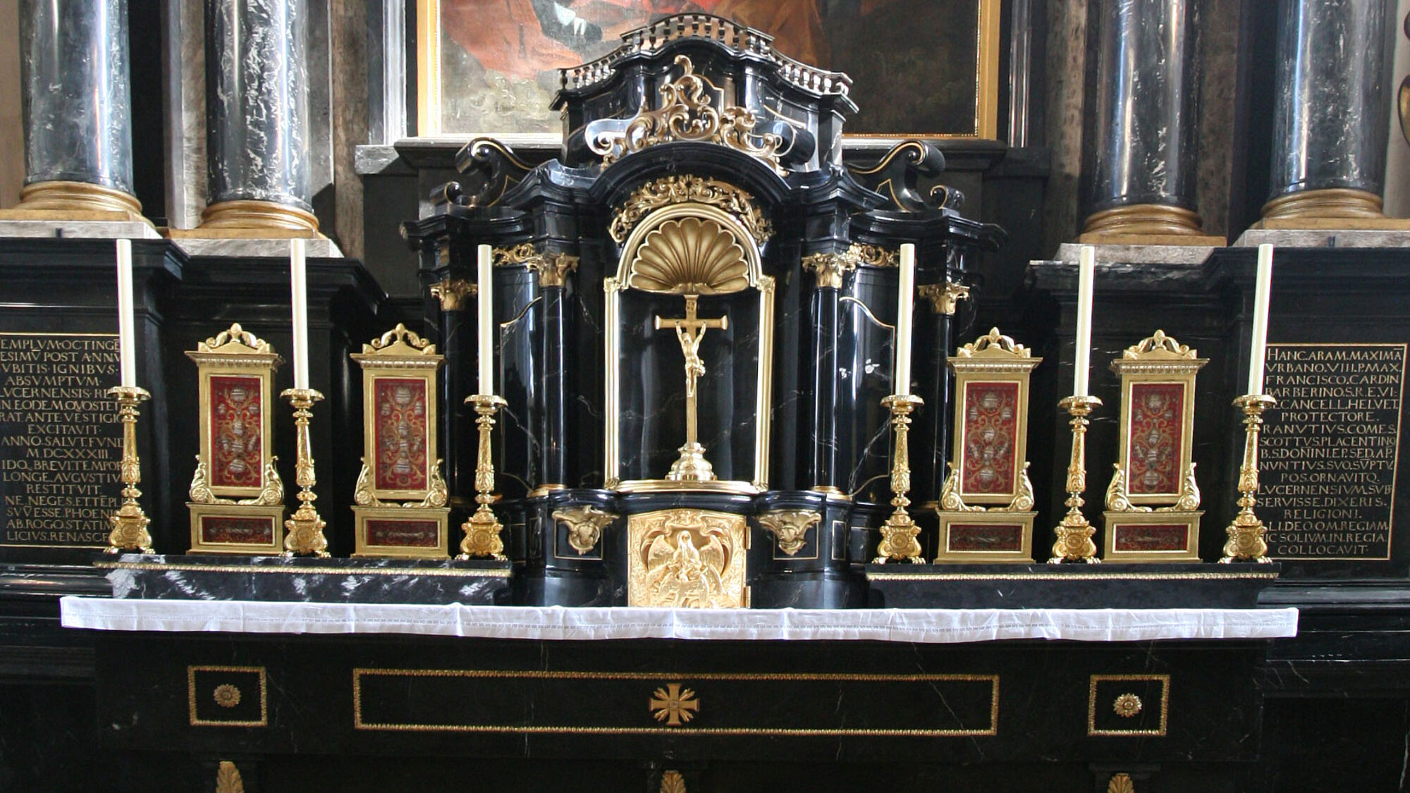 Der Hochaltar wurde nach einem römischen Entwurf in schwarz-grauem Marmor gebaut, der aus einem Steinbruch am Stanserhorn stammt. Die weissen Teile sind aus Alabaster, der ebenfalls in der Innerschweiz gebrochen wurde. Nach seiner Aufrichtung 1639 machte der Altar auf die Gläubigen mächtigen Eindruck, denn bis jetzt wurde diesseits der Alpen noch nie ein Altar in römischem, klassischem Barock errichtet. Das Altarbild mit der Ölbergszene malte der römische Maler Giovanni Lanfranco.