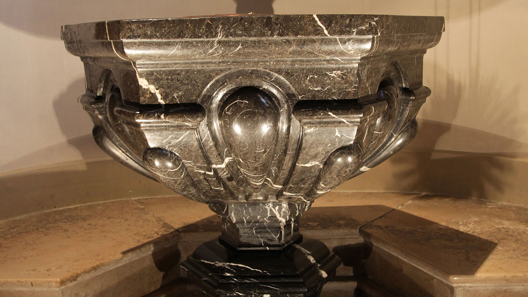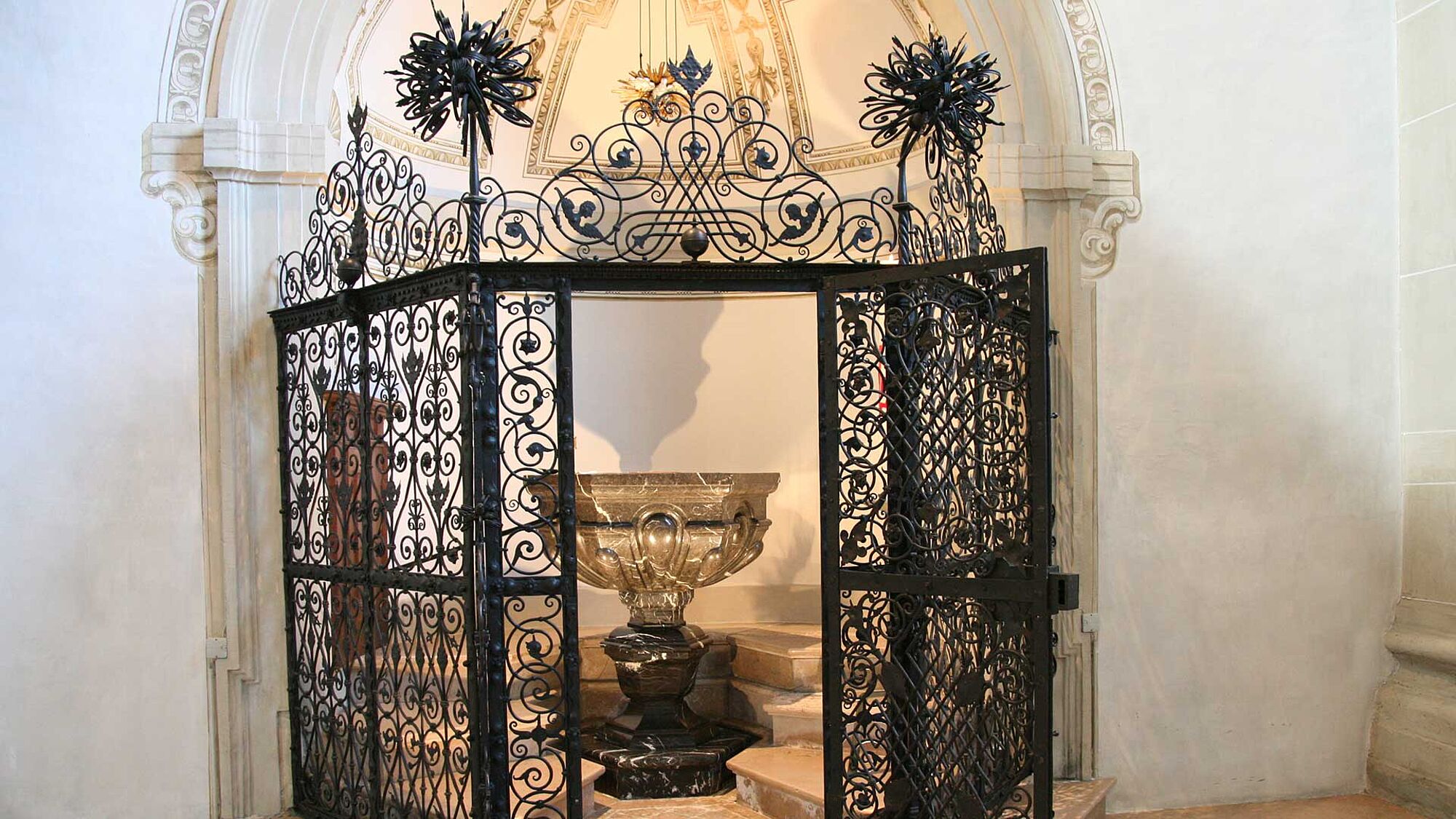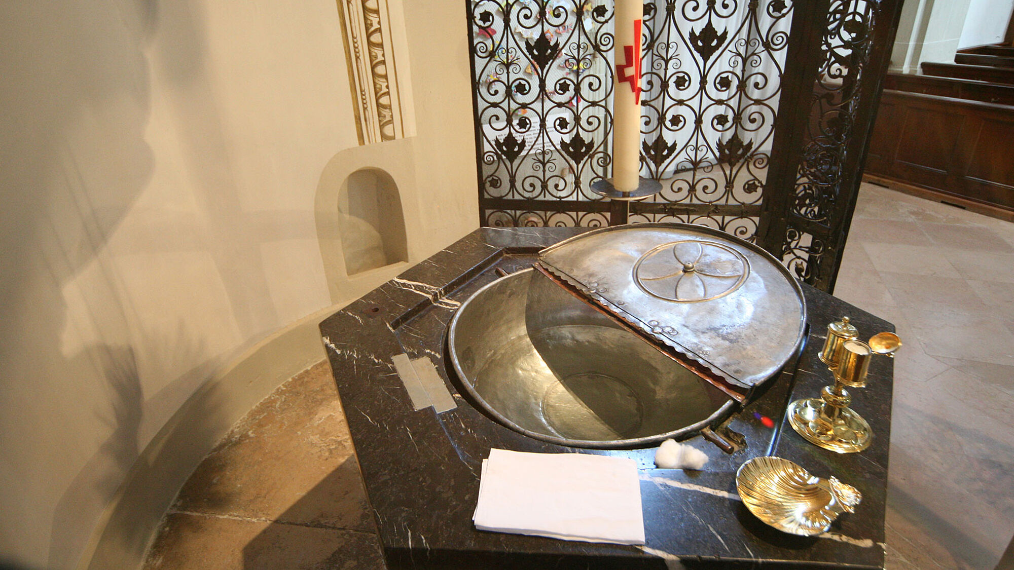 Der kelchartige Taufstein aus schwarzem Marmor wurde als eines der ersten Werke in der Kirche von Niklaus Geissler geschaffen. Er diente als Vorbild verschiedener Taufsteine in der Zentralschweiz. Das Gitter fertigte der Luzerner Kunstschlosser Christoph Kaltpach an.